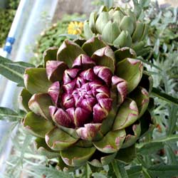 Artichoke学名:Cynara Scolymusキク科 チョウセンアザミ属 多年草ヨーロッパの市場では、かご一杯の食用の大きな蕾が売られている光景を良く見かけます。食用としてだけでなく、お庭に植えると大きなシルバーリーフがアクセントになります。高さ1.5mくらいで、青みがかった銀葉は大きく分裂し、下面には白い綿毛が密生します。夏に、直径15cmほどのピンクがかった紫色の球のような花をつけます。【料理】蕾は塩ゆでして食べます。花は食卓や料理の装飾にもなります。【場所】日当たりがよく、湿り気のある所を好みます。【土】肥沃な土を好みます。